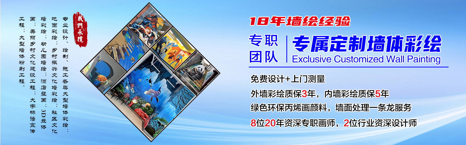 業(yè)務范圍涵蓋:社區(qū)文化建設彩繪;校園文化建設彩繪;各類文化墻彩繪;古建彩繪;家居彩繪;幼兒園墻繪;酒店壁畫;3D立體畫;文化街美化工程的建設;美麗鄉(xiāng)村文化建設工程;房地產(chǎn)圍擋樓盤展示工程;大字標語宣傳工程;浮雕雕塑、門樓牌樓、噴泉假山等工藝美術施工工程;各種大型墻體粉刷工程。